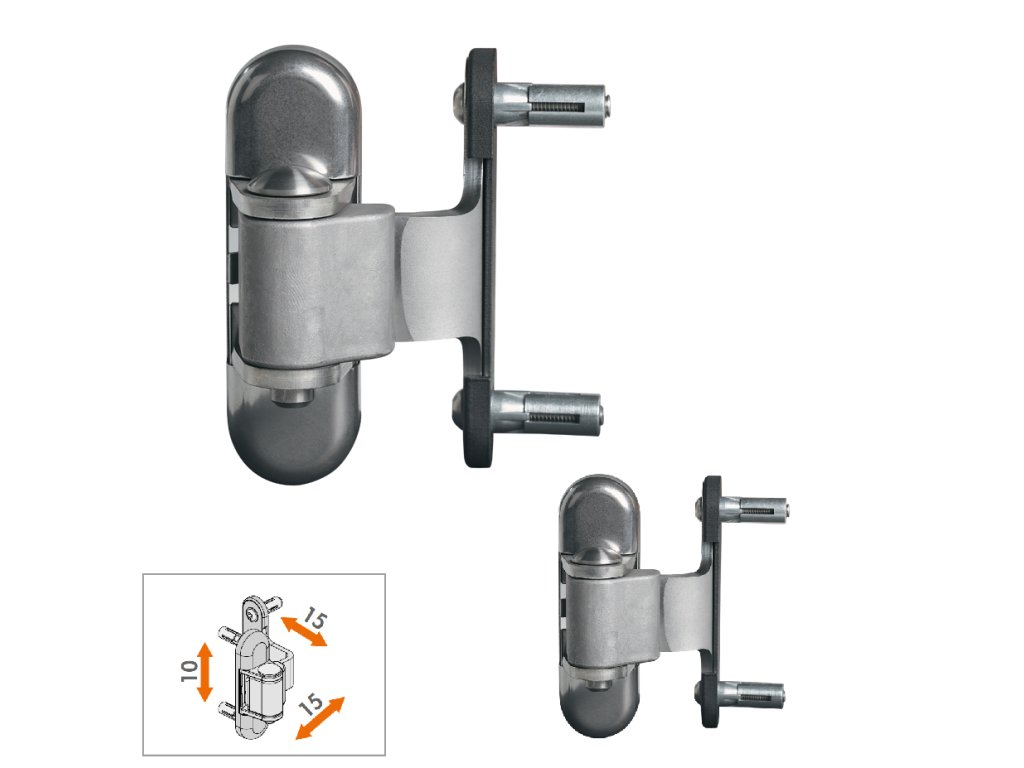Nerezový 180° otevíratelný závěs pro hliníková/kovová vrata nastavitelný ve třech směrech. Pomocí regulace závěsu docílíte souběžnosti křídel (například při vyosení sloupku vlivem mrazu). Závěs umožňuje regulaci 10mm na šířku (X), 10mm na výšku (Y), 15mm na hloubku (Z).180° otevíratelný závěs
