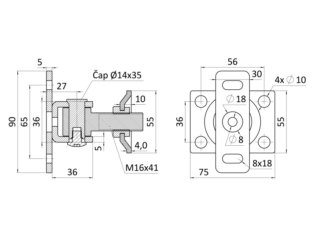 Záves M16 s platňou 75 x 55 mm, otvárateľný 90°, nastaviteľný, čiastočne pozinkovaný, s AL prírubou