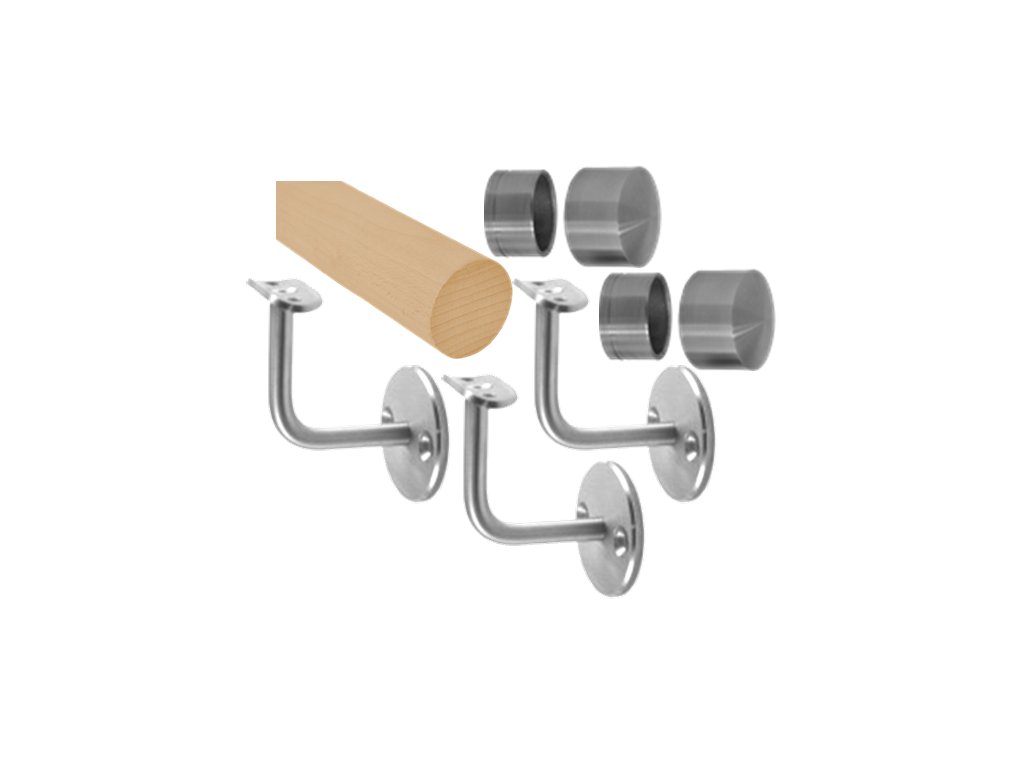 Madlo dřevěné (2000 mm), materiál: buk, broušený povrch bez nátěru, set: 3ks úchyt, madlo s nerezovým ukončením