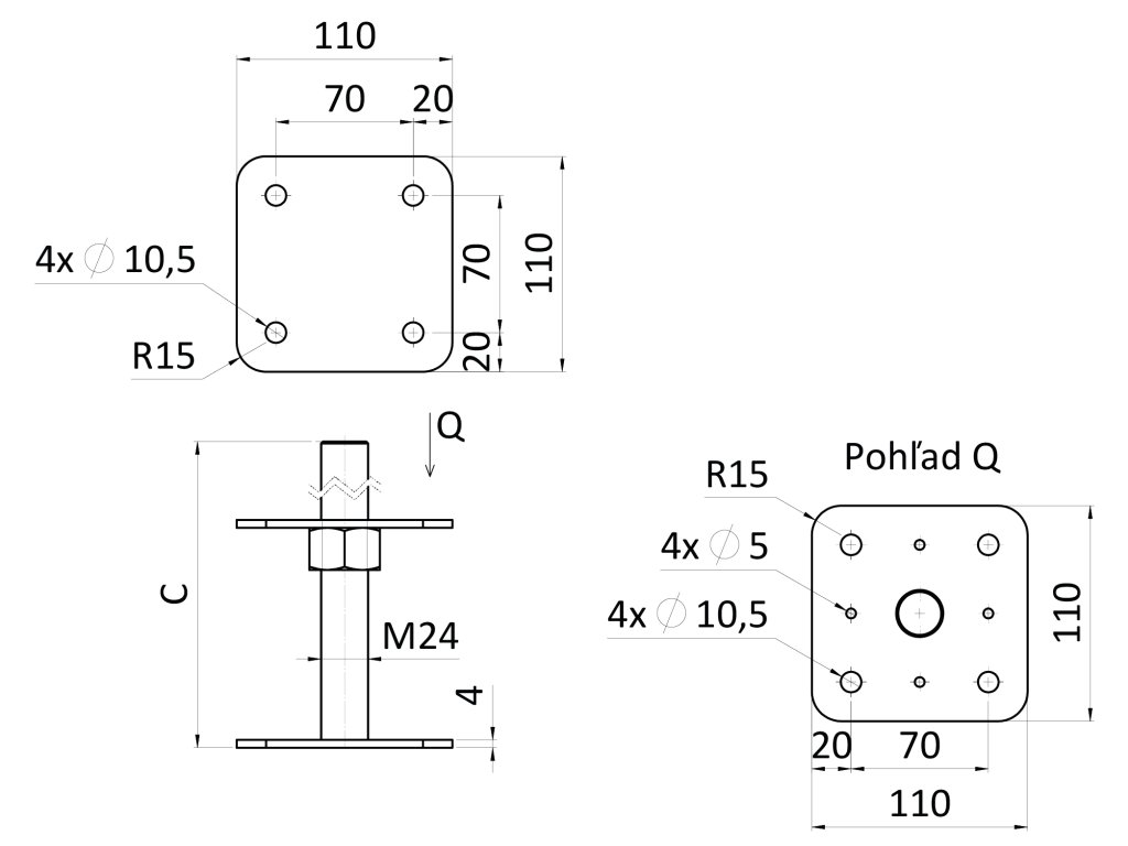 Kotvící patka pilíře 110x110 s pevnou horní deskou 110x110, maticí M24, pozink, výška 200mm