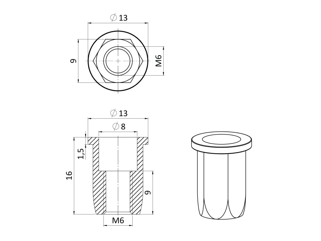 Nitovacia matica M6/0.3-3.0/ plochá hlava, hex, L=14.5mm, nerez