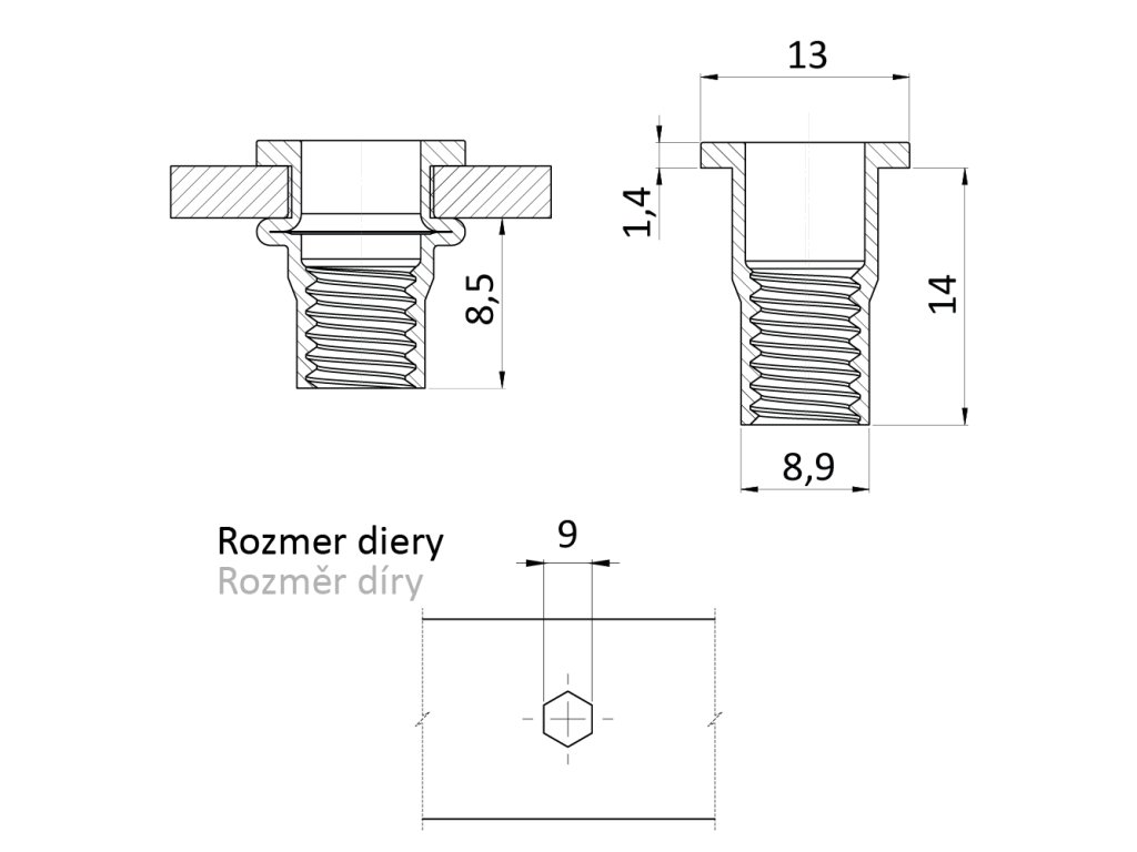 Nýtovací matice M6/2.0-2.5/ plochá hlava, semi-hex, L=14mm