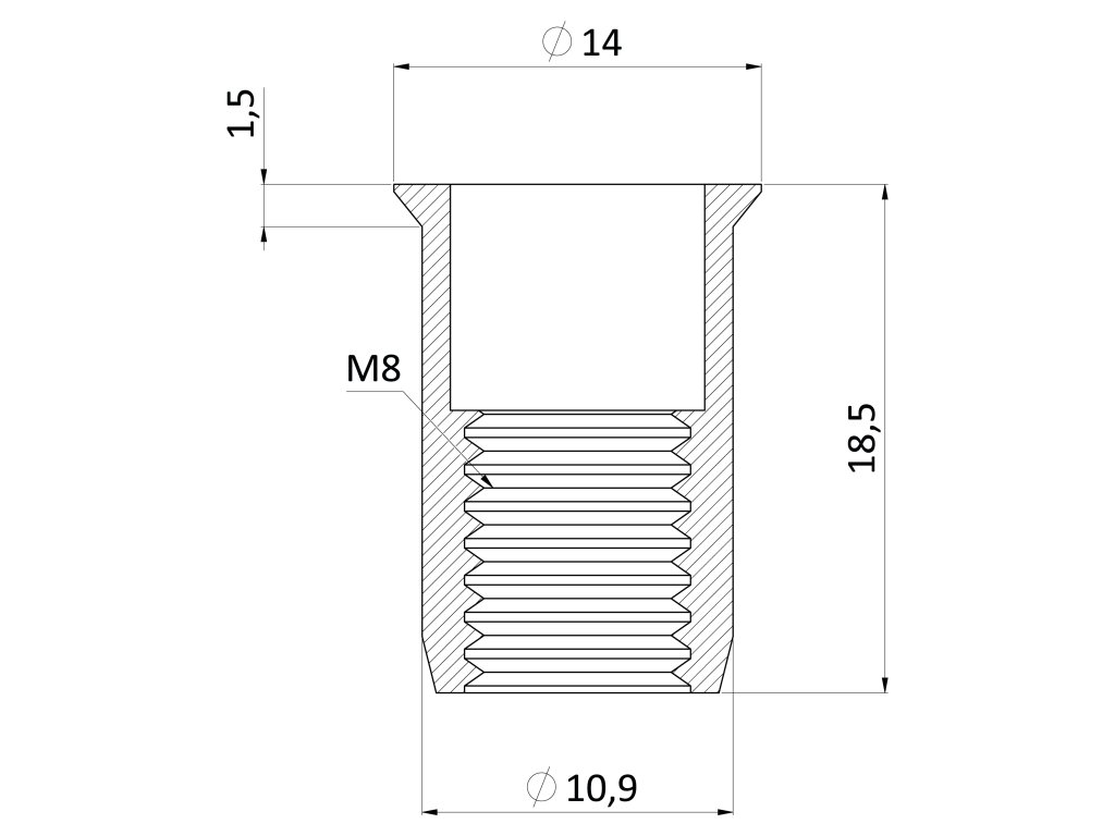 Nýtovací matice M8 se zápustnou hlavou, rýhovaný dřík, ocel-bílý pozinkDoplňkové parametry