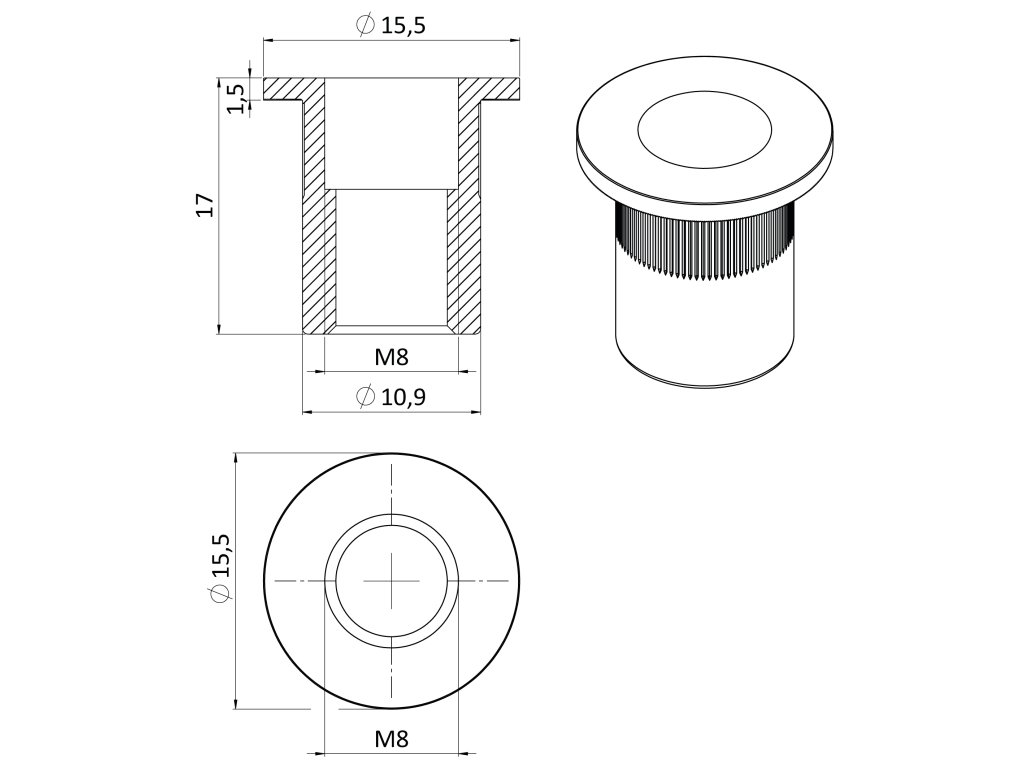 nerezová límcová Nýtovací matice M8, zapustená hlava, ryhovaný driek, AISI304