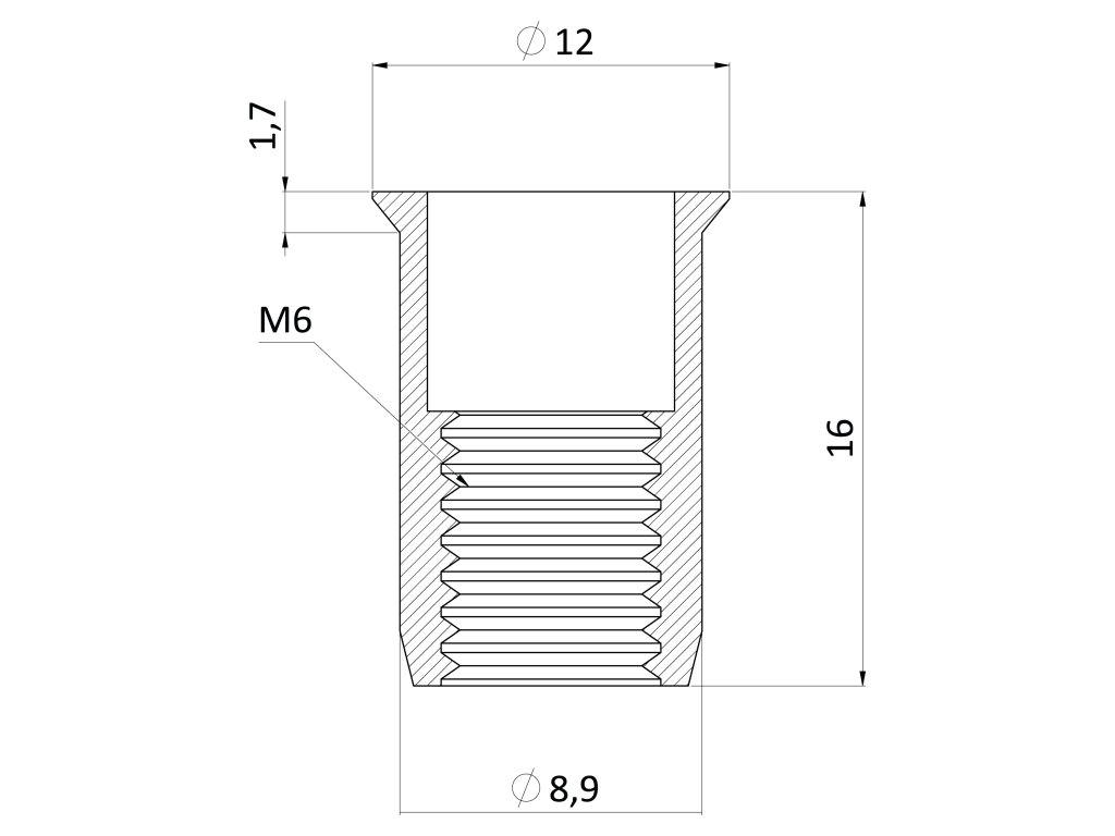 Nerezová nýtovací matice M6, zapuštená hlava, rýhovaný dřík, AISI304