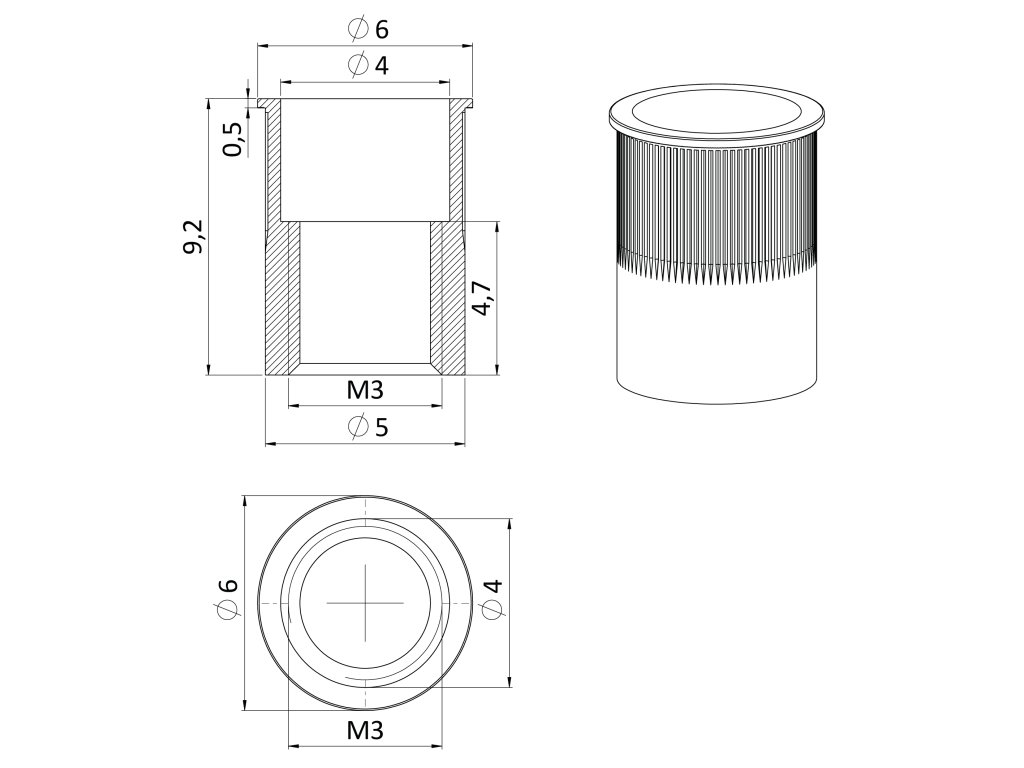 Nerezová redukovaná nitovacia matica M3, zapustená hlava, ryhovaný driek, AISI304