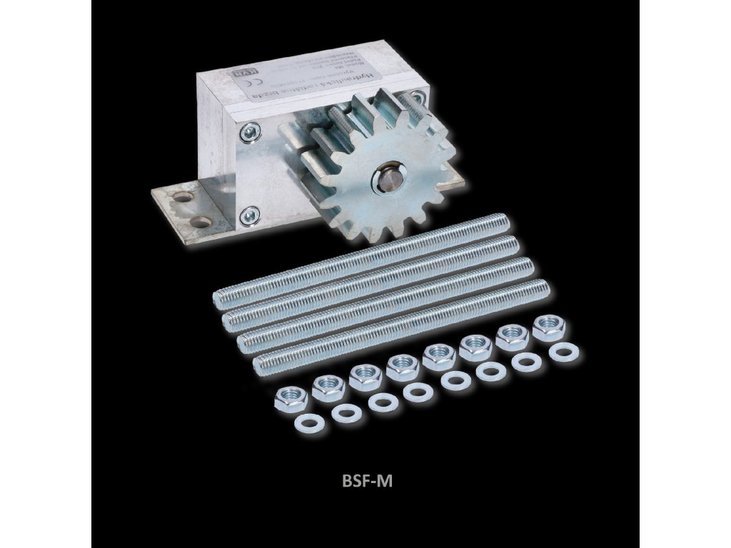 Radiální brzda BSF-M s ozubeným pastorkem MODUL M4 (16 zubů) je určená k nepřetržité kontrole rychlosti pohybu posuvných bran. U bran postavených do svahu brzda reguluje a kontroluje zavírací rychlost v rozsahu celé dráhy posuvné brány a zaručuje bezpečnost po odblokování pohonu (např. pří výpadku dodávky elektrické energie). Brzda odlehčuje zatížení pohonu brány a díky tomu prodlužuje jeho životnost.Maximální zatížení brzdy je 7Nm!