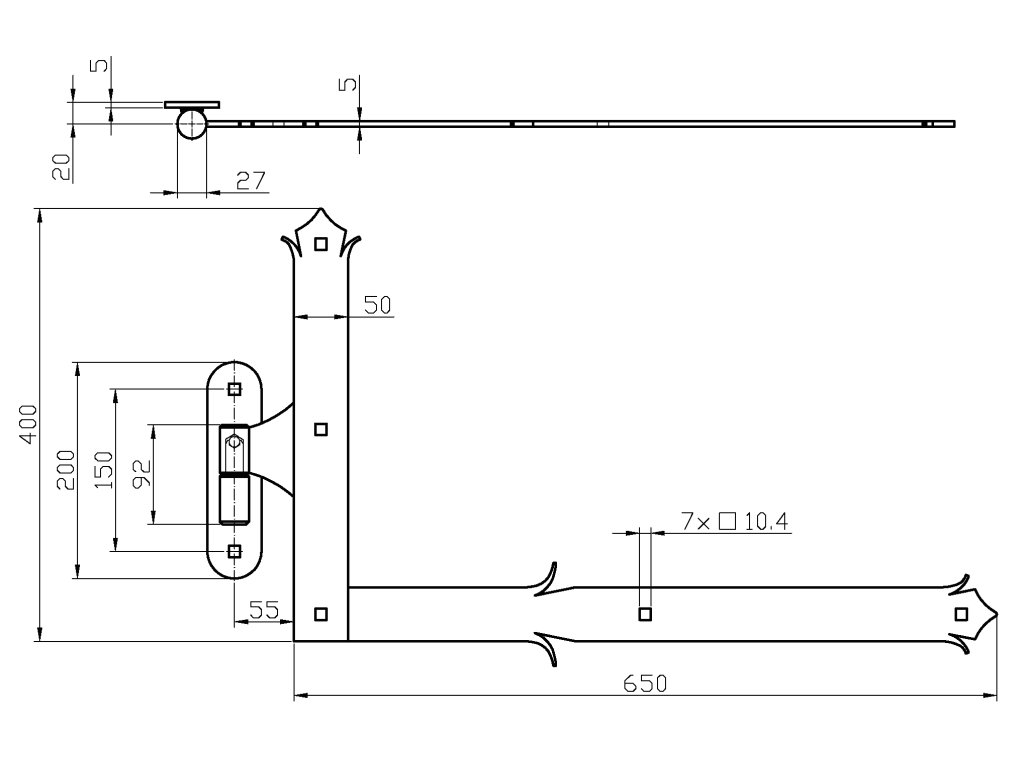 Kování ozdobné SPODNÍ, 400x650mm s čapom, profil 50x5mm, černá barva, oboustranný
