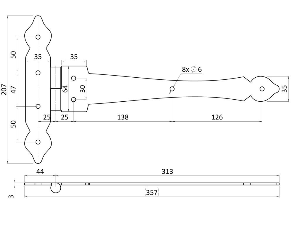kovanie ozdobné, H-206 x L-354 x 3mm, ľavé, povrch RAL9005 matná