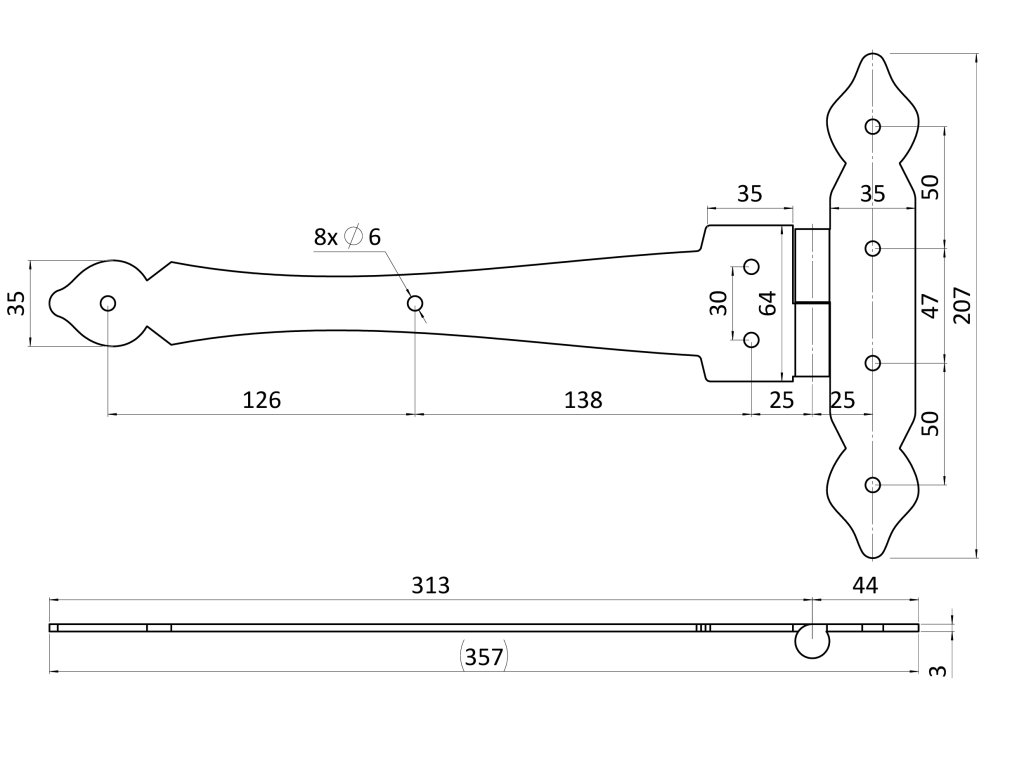 kovanie ozdobné, H-206 x L-354 x 3mm, pravé, povrch RAL9005 matná