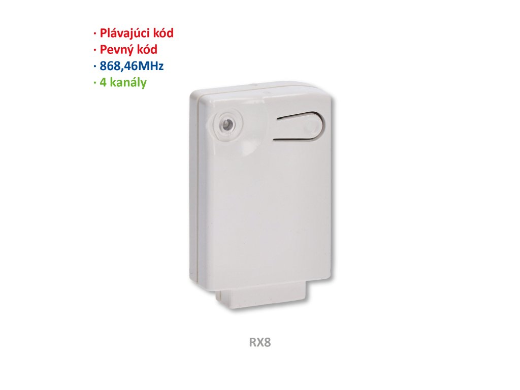 Přijímač interní 4-kanálový (868 MHz), pevný nebo plovoúci kód, paměť: 400 kódůDoplňkové parametry
