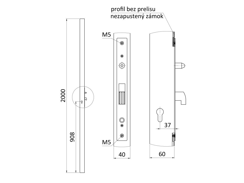 Profil 60 x 40 x 1,5 mm, H= 2000 mm se zapuštěným zámkem, vhodný pro rám posuvné branky, bez povrchové úpravy, bez vložky, kompatibilní s dorazovou lištou ZMH40L.Oboustranné použití zámku.