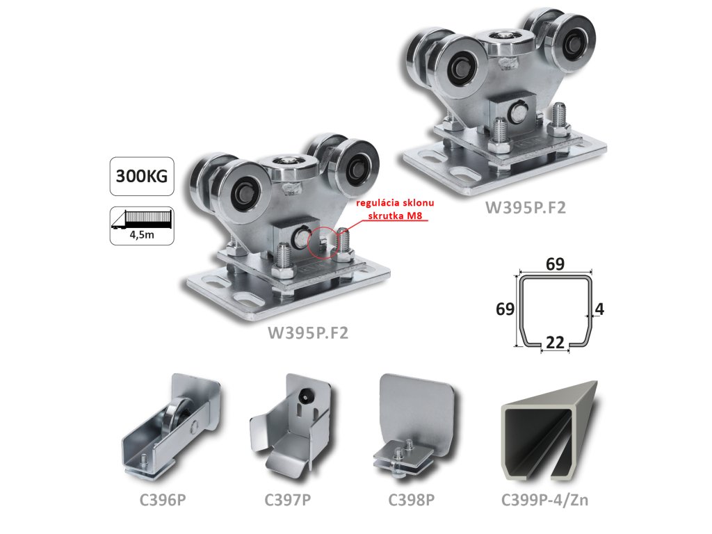 Samonosný systém 69x69x4 pro posuvné brány do 200 kg / 4,5 m otvor (C399P-4/Zn 1x6m pozinkovaný profil, W395P.F2 2ks, C396P 1ks, C397P 1ks, C398P 1ks)Doplňkové parametry