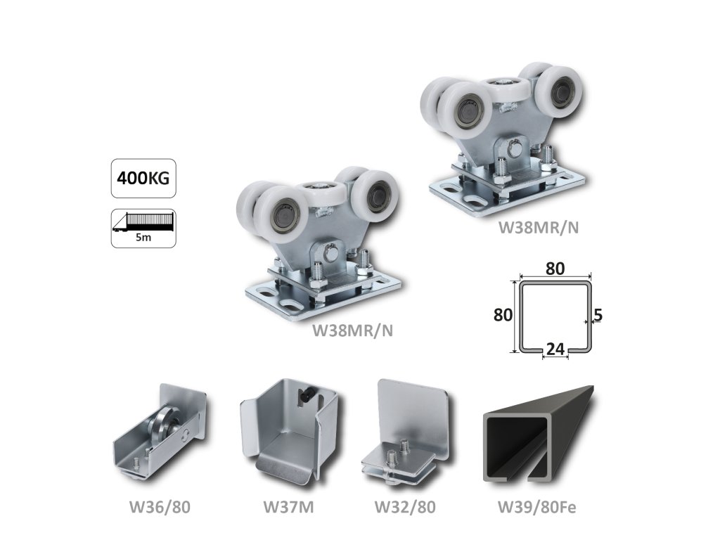 Samonosný systém 80x80x5 mm pro posuvné brány do 300 kg / 5 m otvor (W39/80Fe 6 m černy profil, 2x W35MR/N, 1x W36/80, 1x W37M, 1x W32/80)Doplňkové parametry
