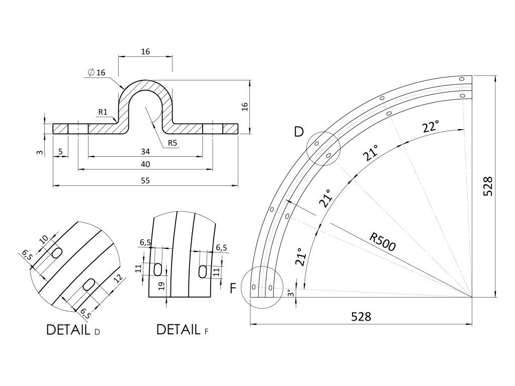 Vodiaci profil pre brány, U ø16mm profil, polomer 0.5m, zakrivenie 90 stupňov
