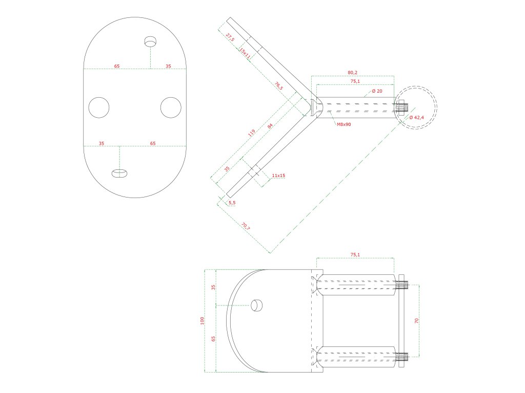 úchyt na vnější rohové kotvení sloupu ø 42.4mm, (kotvící deska tloušťky 5.5mm, ø 100mm), leštěná nerez K320 /AISI304