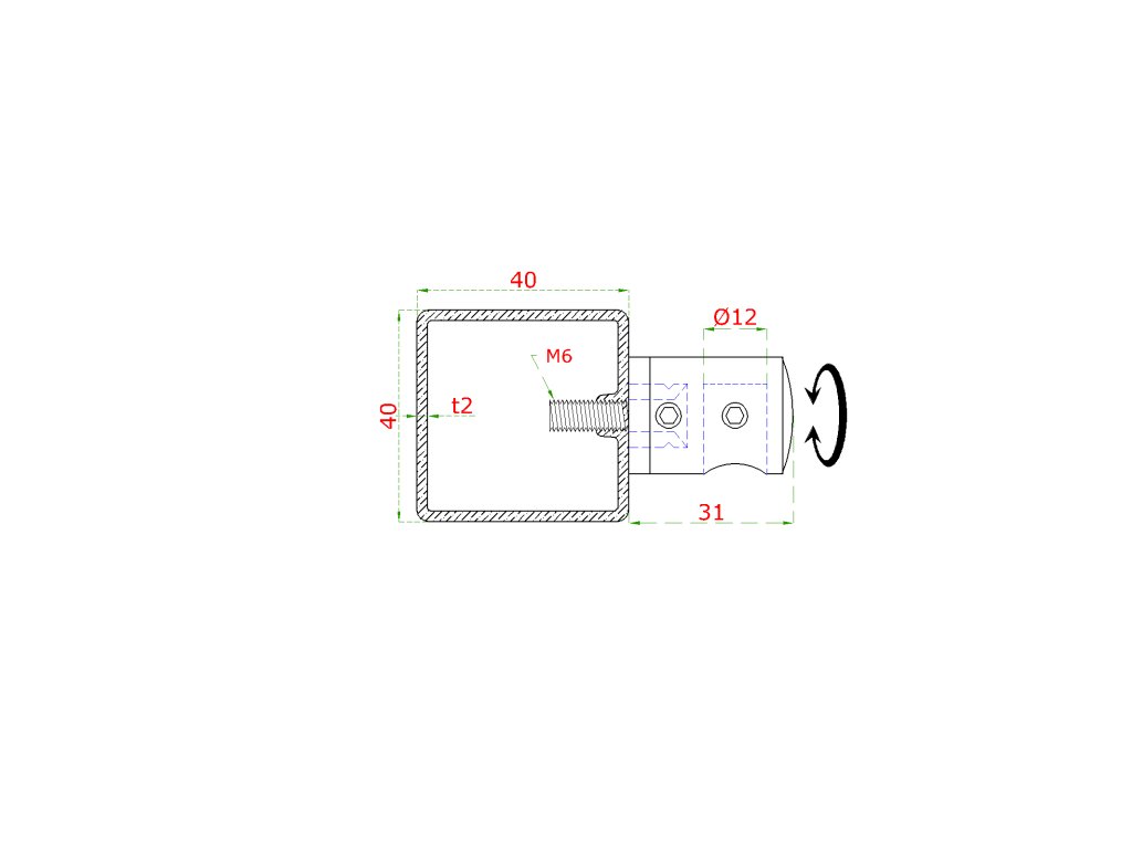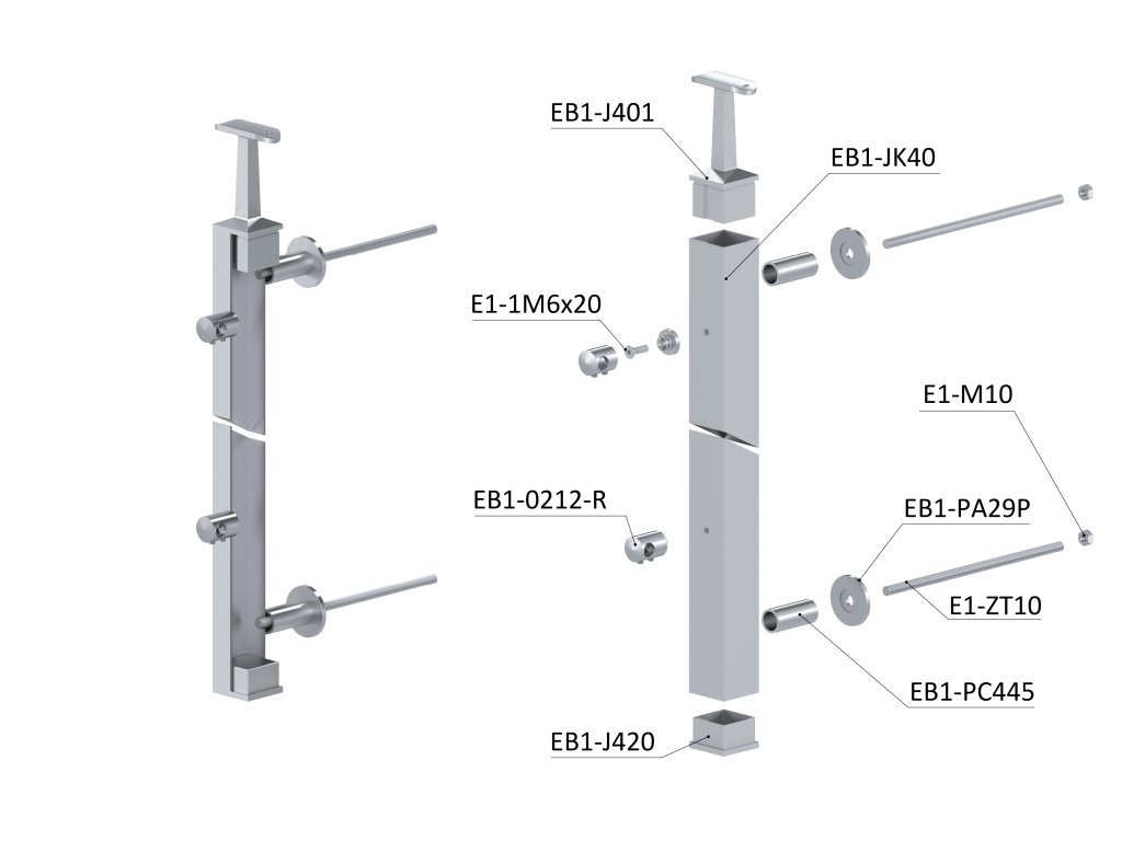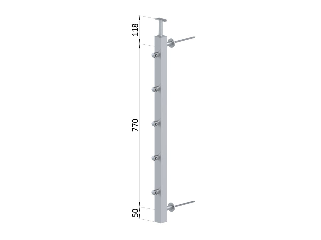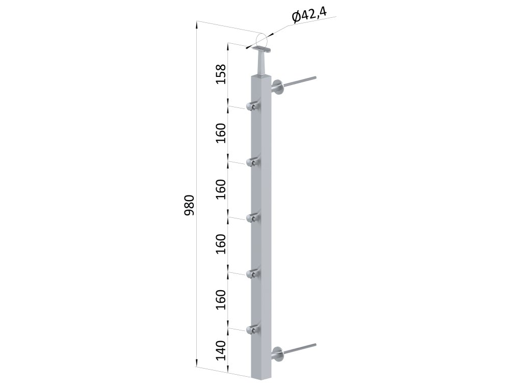 Nerezový sloup na francouzský balkón, boční kotvení, 5 řadový, pravý, vrch pevný, (40x40x2.0 mm), broušená nerez K320 /AISI304Doplňkové parametry