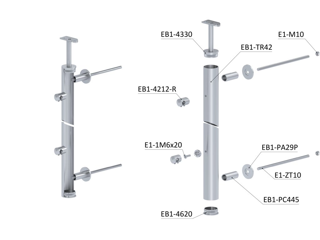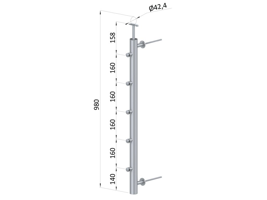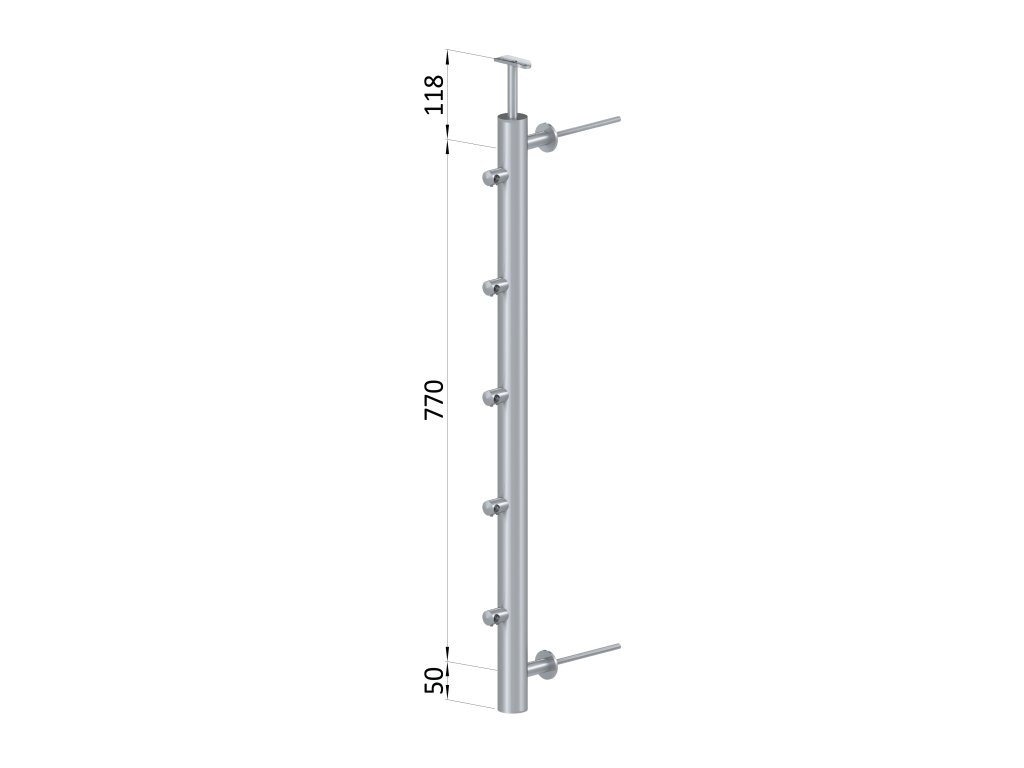 Nerezový sloup na francouzsky balkón, boční kotvení, 5 řadový pravý, vnější, vrch pevný, (ø 42.4x2 mm), broušená nerez K320 /AISI304Doplňkové parametry