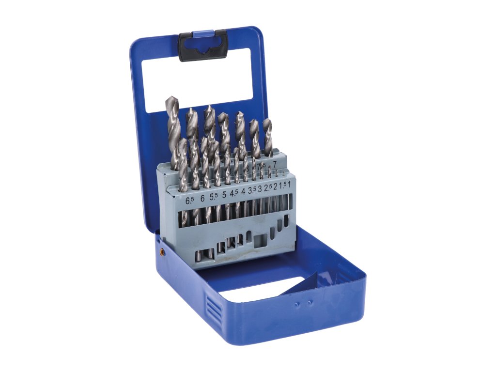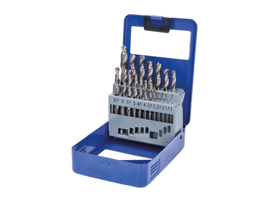 balení obsahuje HSS vrtáky: 1mm, 1.5mm, 2mm, 2.5mm, 3mm, 3.5mm, 4mm, 4.5mm, 5mm, 5.5mm, 6mm, 6.5mm, 7mm, 7.5mm, 8mm, 8.5mm, 9mm, 9.5mm a 10mm-vhodné pro materiály s pevností > 800 N/mm²
