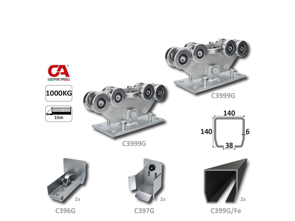 GRANDE-9 samonosný systém 140x140x6 mm pro posuvné brány do 1000 kg / 15 m otvor (C399G/Fe 2x 6 m černý profil, C3999G 2ks, C396G 2ks, C397G 2ks), intenzivní provoz