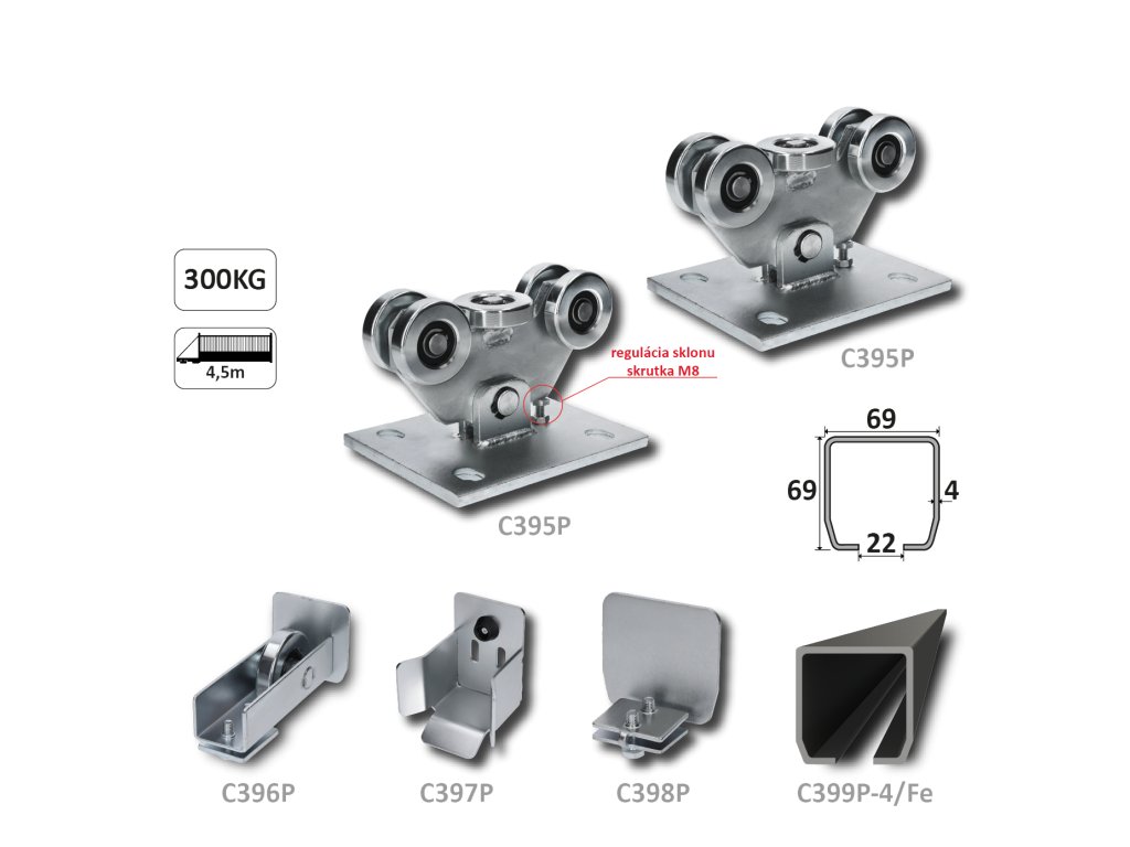 PICCOLO-Klasik samonosný systém 69x69x4 mm pro posuvné brány do 200 kg / 4,5 m otvor (C399P-4/Fe 1x 6 m černý profil, C395P KLASIK 2ks, C396P 1ks, C397P 1ks,C398P 1ks), intenzivní provozDoplňkové parametry