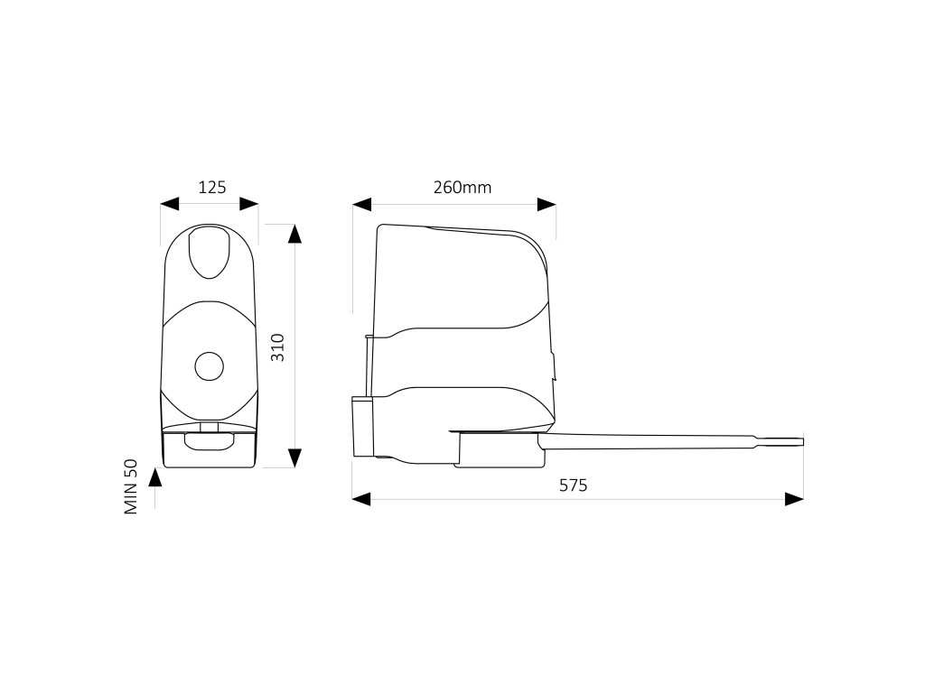🔹 Kompaktní rozměry – Vhodný i pro úzké sloupky od 100 mm a umožňuje zapuštění křídla brány až do 200 mm.