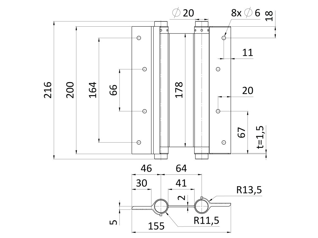 Dvojčinný otočný pant o výšce 200 mm je vybavený samozavíracím mechanismem a umožňuje otevírání dveří na obě strany. Je vyrobený z kvalitní nerezové oceli, díky čemuž je odolný vůči povětrnostním vlivům a vhodný pro použití v interiéru i exteriéru.