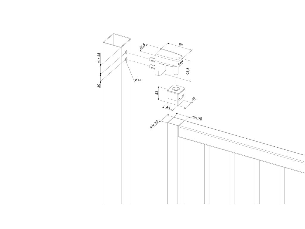 Volitelné příslušenství: zavírač INTERIO je určen k instalaci do sloupku 50x50mm nebo 60x60mm. Adaptér pro montáž na stěnu resp. na zem není součástí balení. Adaptér je volitelné příslušenství.