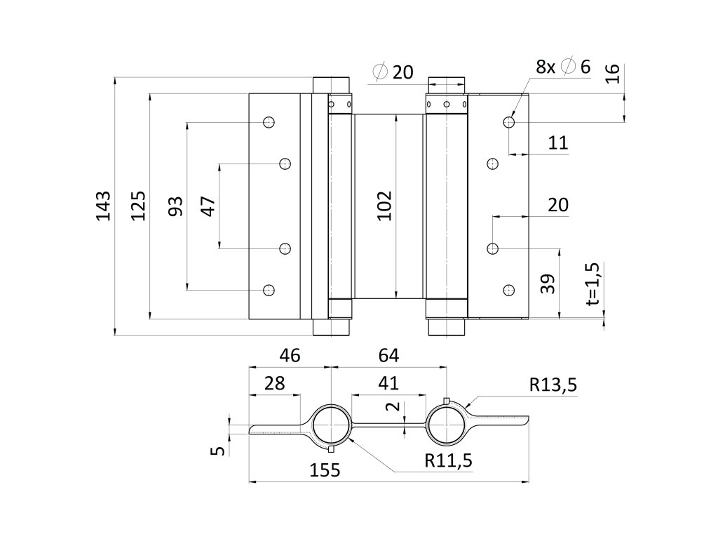 Samozavírací pant dvoučinný pro křídlové dveře, H - 125mm, nerezový