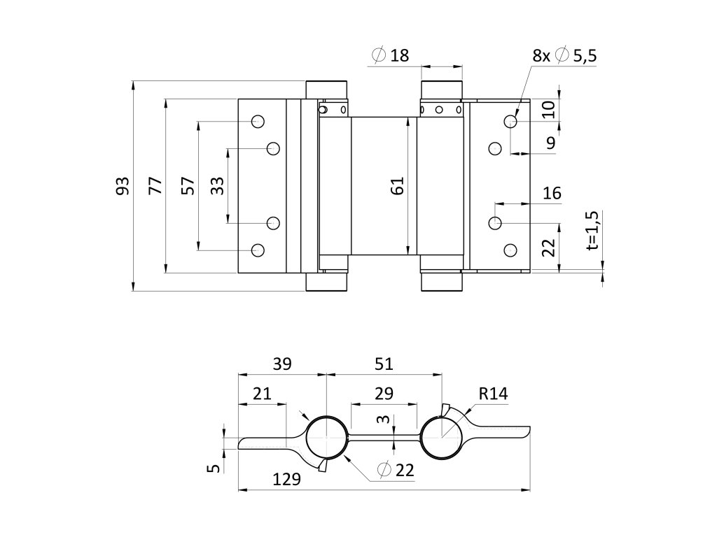 Samozavírací pant dvoučinný pro křídlové dveře, H - 75mm, nerezový