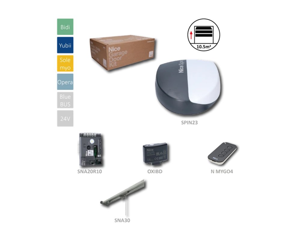 SPIN23BDKCE sada pro sekční vrata do 10,5m2, zdvih do 235cm, 1x SPIN23 (24V, 250W, 650N), 1x SNA20R10 s přijímačem, 1x ON2E, 1x SNA30 1x OXIBD