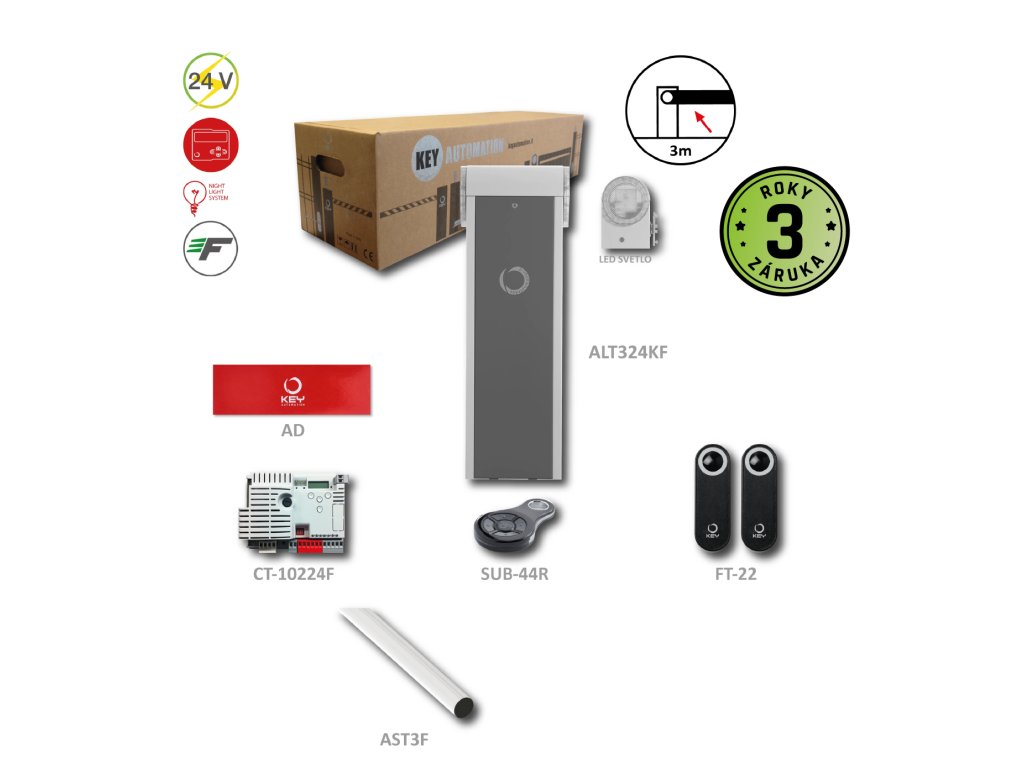 FAST LINE rychlá závora do 3 m se zabudovaným majákem (24 V, 330 W, 40 Nm) s elektronikou CT-10224F, 1x AST3F, 1x SUB44R, 1x FT22, 500 cyklů/hod., 1 sekunda otevření.Doplňkové parametry