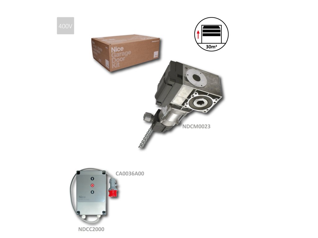TOTMAN sada pro průmyslová sekční vrata do 30 m², 1x NDCM0199 (400 V, 100 Nm), 1x D-PRO ACTION NDCC2000, 1x propojovací kabel CA0175A00 7m, 5 m řetěz, 1x CEE, elektrické koncové dorazy, konektor OXIBD, otvor pro hřídel o Ø 25 mmDoplňkové parametry