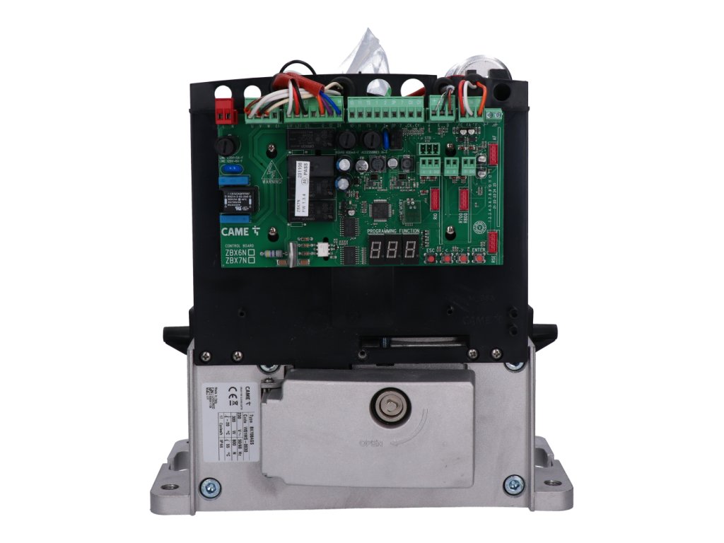 - Pohon BX708AGS: Elektromechanický pohon s 230V motorem a výkonem 520 W. Zajišťuje tichý a plynulý chod brány s maximální rychlostí 0,12 m/s. Pohon je vybaven enkodérem pro přesné řízení a plynulé zpomalení. Disponuje integrovanou řídící jednotkou ZBX7N s programovacím displejem, dekódováním přijímače, detekcí pohybu a překážek a mechanickými koncovými spínači.