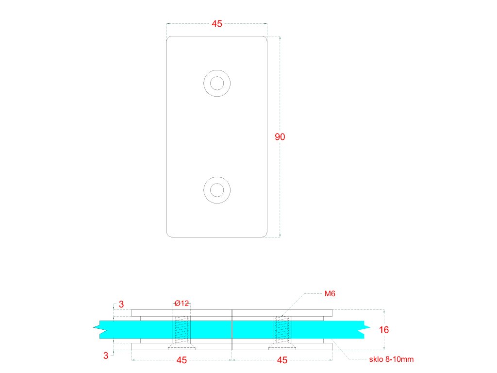 Svorka skla na skleněný dveřní systém, mezi sklo a sklo 180°, 45x45x16 mm, tloušťka skla 8-10 mm, broušená nerez K320 / AISI304Doplňkové parametry