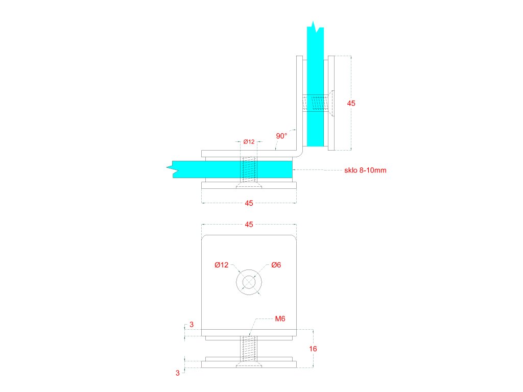 Svorka skla na skleněný dveřní systém, mezi sklo a sklo 90°, 45x45 mm, tloušťka skla 8-10 mm, broušená nerez K320 / AISI304Doplňkové parametry