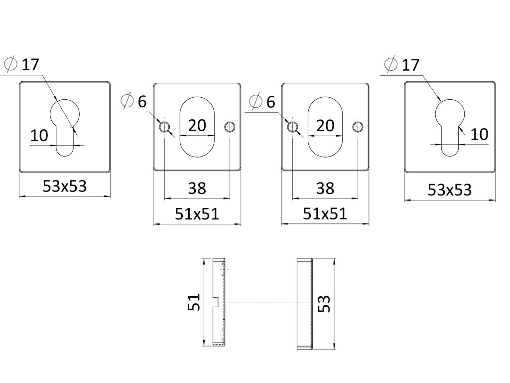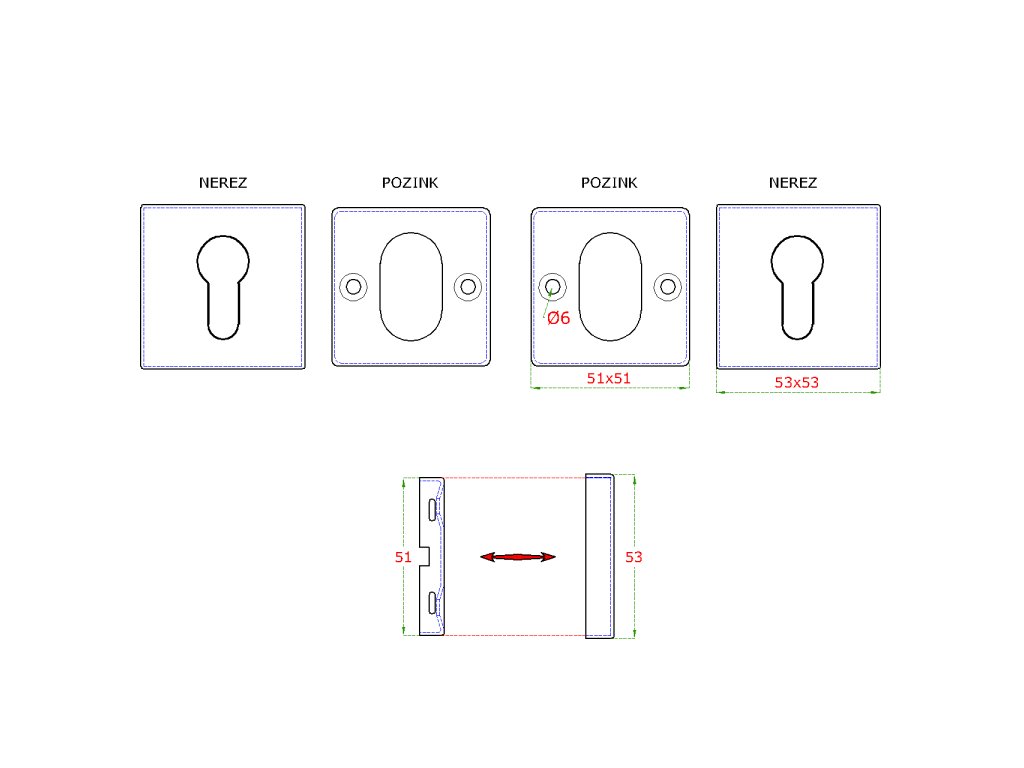 Čtvercová rozeta na cylindrickou vložku (54x54mm), bal .: 1 pár, broušená nerez K320 / AISI304, spodní část pozinkDoplňkové parametry