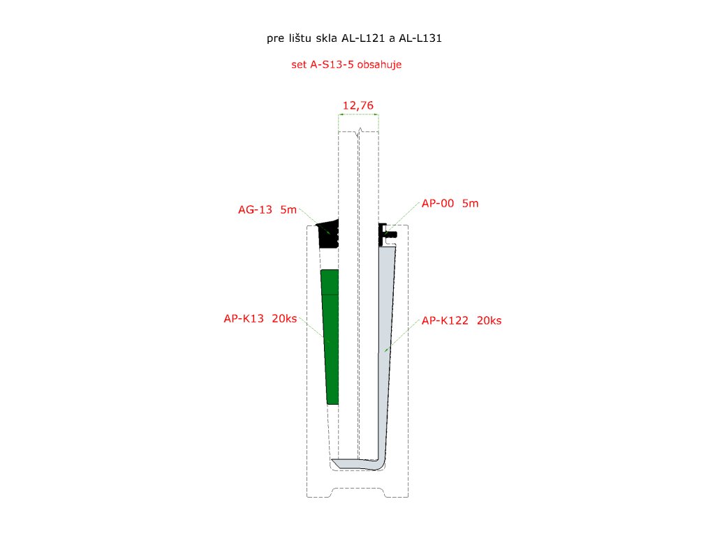 5m set pro 12,76mm sklo, k profilu AL-121, AL-L131, AL-L141 a AL-L151. Obsahuje: těsnění AG-00 5m, AG-13-5m, podložka AP-K122 20ks, klin AP-K13 20ks.Doplňkové parametry