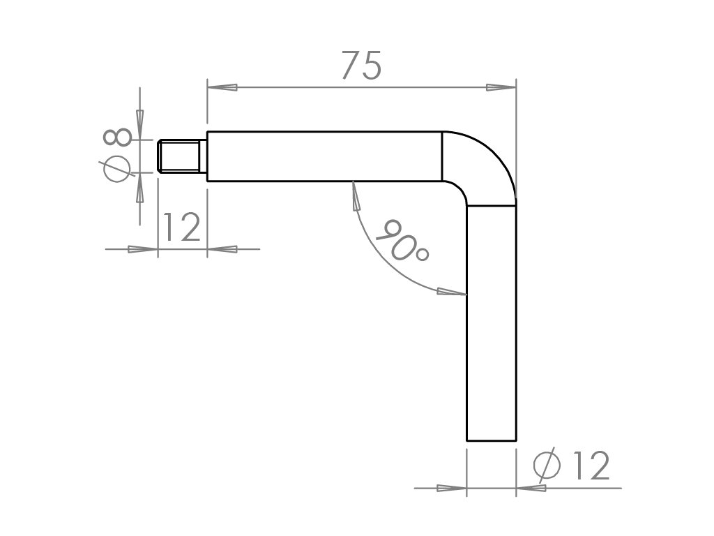 Úhelník (90°, vnější závit M8 / vnitřní závit M6, ø 12 mm L: 75x75 mm), broušená nerez K320 / AISI304Doplňkové parametry