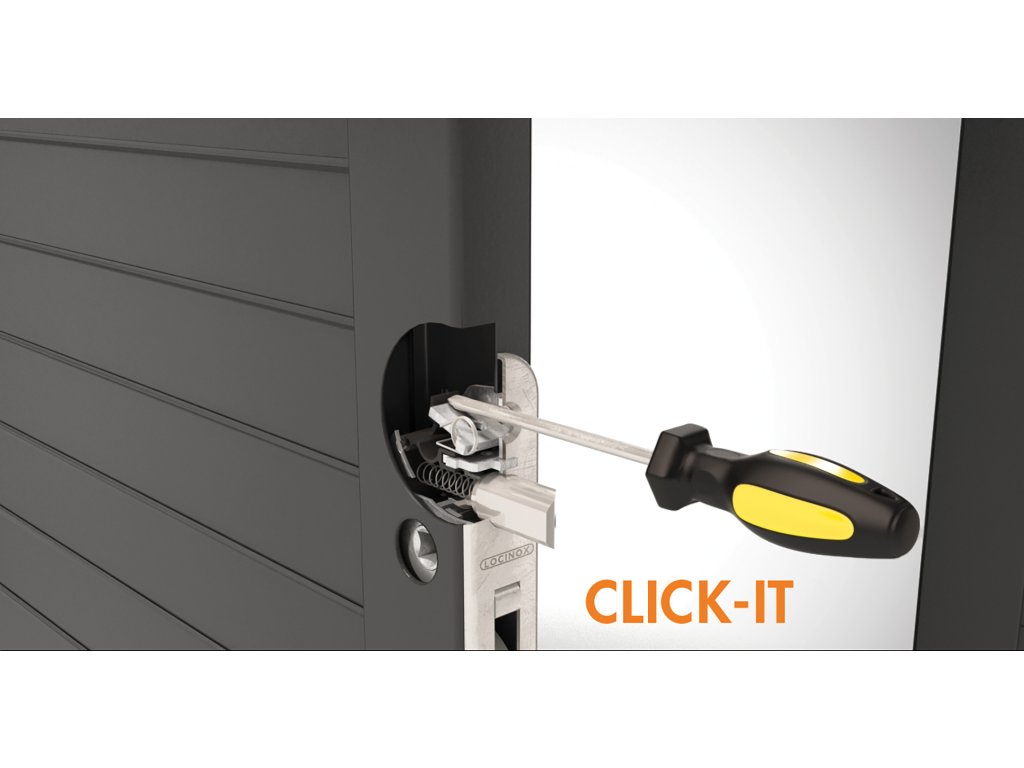 Mechanický zámek s mechanismem z nerezavějící oceli, odolný proti nečistotám. Jazýček je nahrazen výklopným hákem, který má vyšší odolnost vůči vandalství a násilnému otevření (vylomení, křídlo brány nelze odtáhnout od sloupku). Zámek lze instalovat na kovové, také na PVC vrata. Rychlá montáž díky patentovanému systému „Click-it.Klika a krycí štítky nejsou součástí balení, je nutno objednat samostatně.