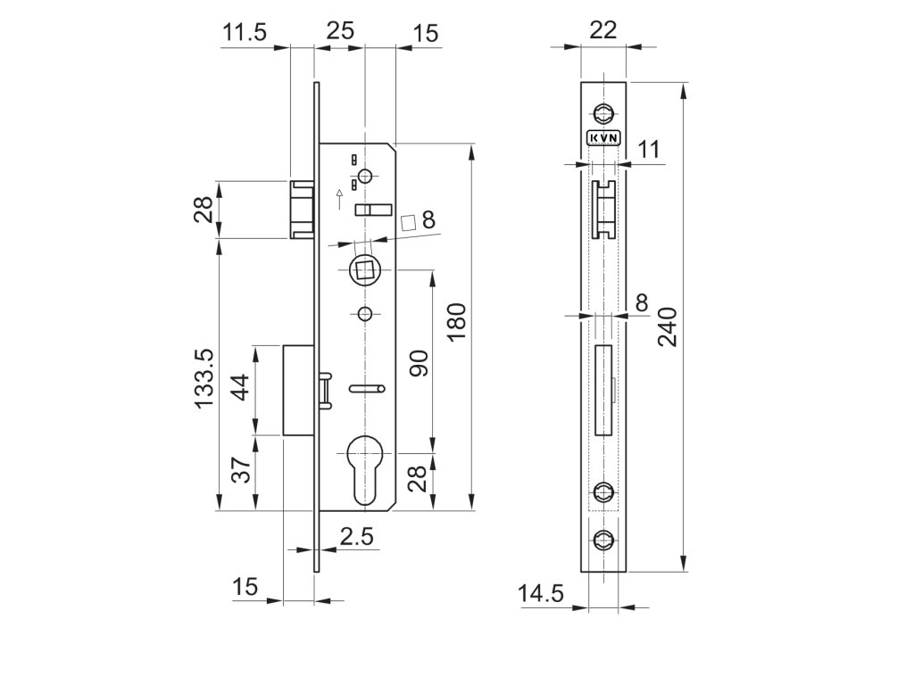 Zámek vložkový, hloubka 40 mm, rozteč 90 mm, poniklovaná přední lišta