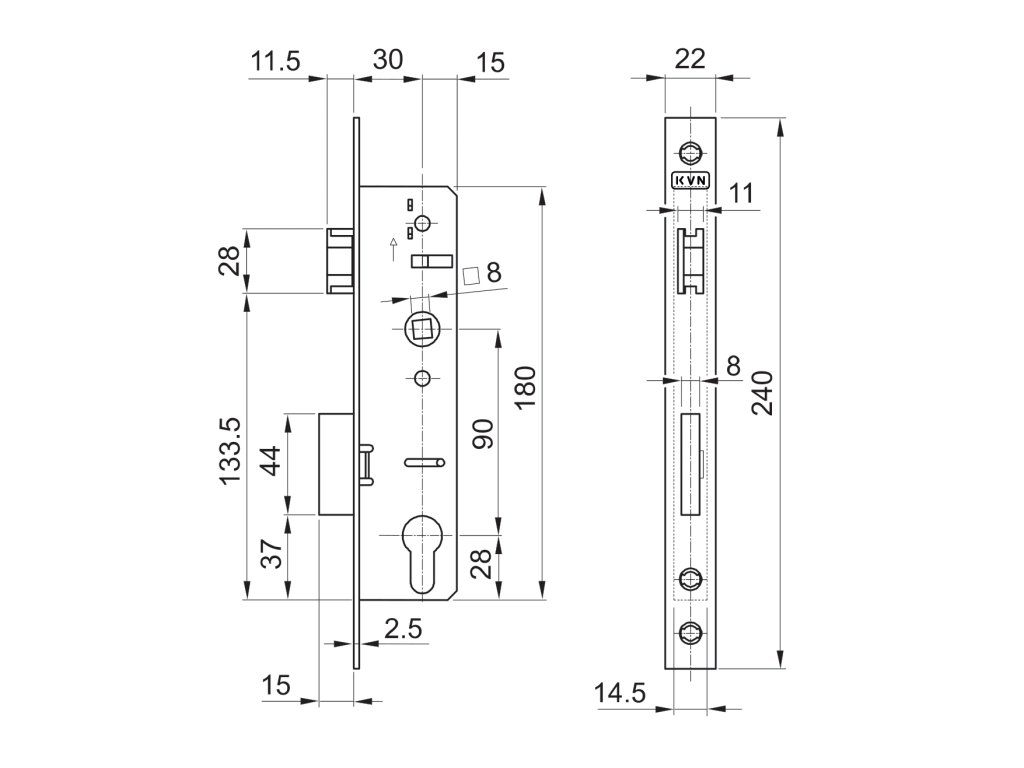 Zámek vložkový, hloubka 45 mm, rozteč 90 mm, poniklovaná přední lišta