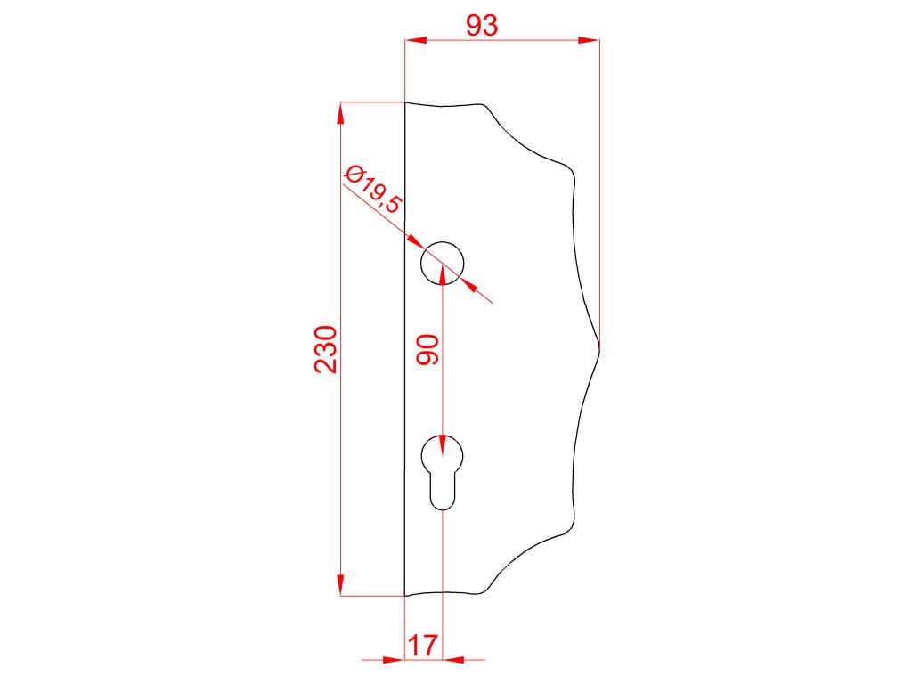 Štít 230x93x3mm s otvory, rozteč 90mm, otvor pro kliku ø 19,5mm, zdobený, pravý, pro zámek ZM90/80