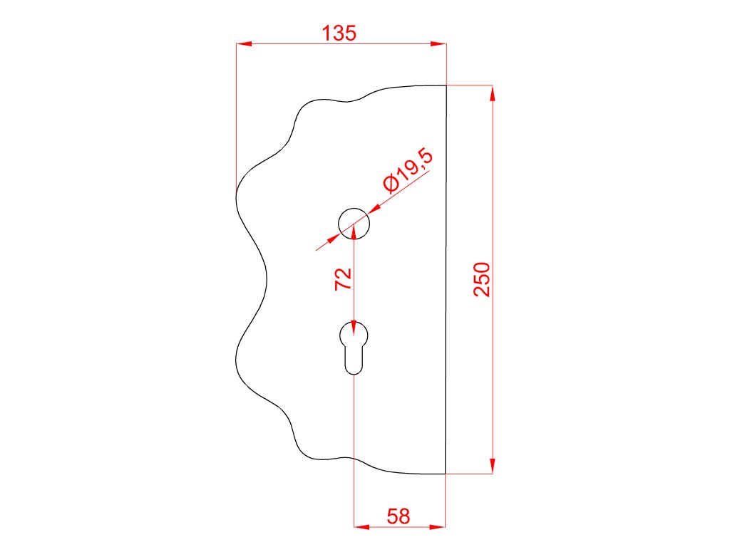 Štít 250x135x3mm s otvory, rozteč 72mm, otvor pro kliku ø 19,5mm, hladký, oboustranný (levý i pravý), pro zámek ZMH331