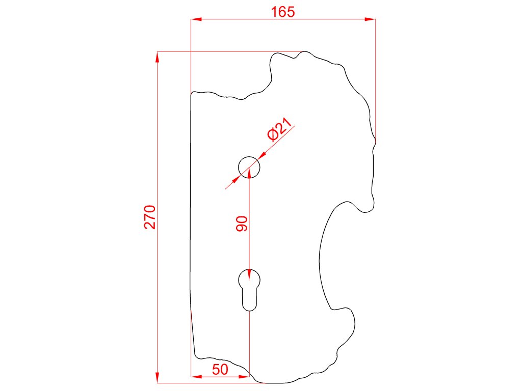 Štít 270x165x2mm s otvory, rozteč 90mm, otvor pro kliku ø 21mm, zdobený, levý, pro zámek ZM90/80