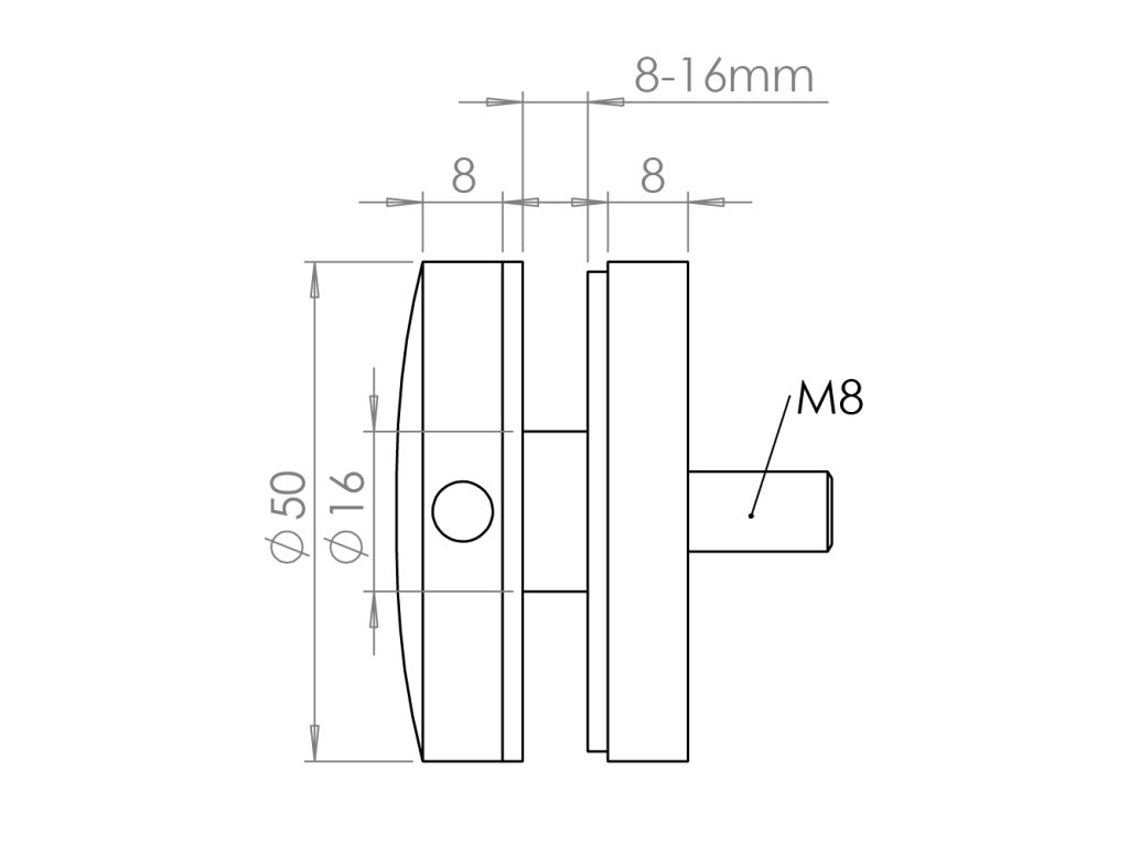 Svorka bodová na sklo 8-16 mm plochá (ø50mm/ M8), broušená nerez K320/ AISI304, balení obsahuje gumičky na skloDoplňkové parametry
