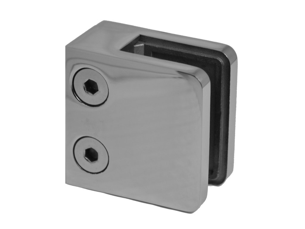 Svorka skla / plechu plochá (45x45x26 mm), bez úchytových šroubů a krytek na šrouby, leštěná nerez / AISI304, balení neobsahuje gumičky na sklo