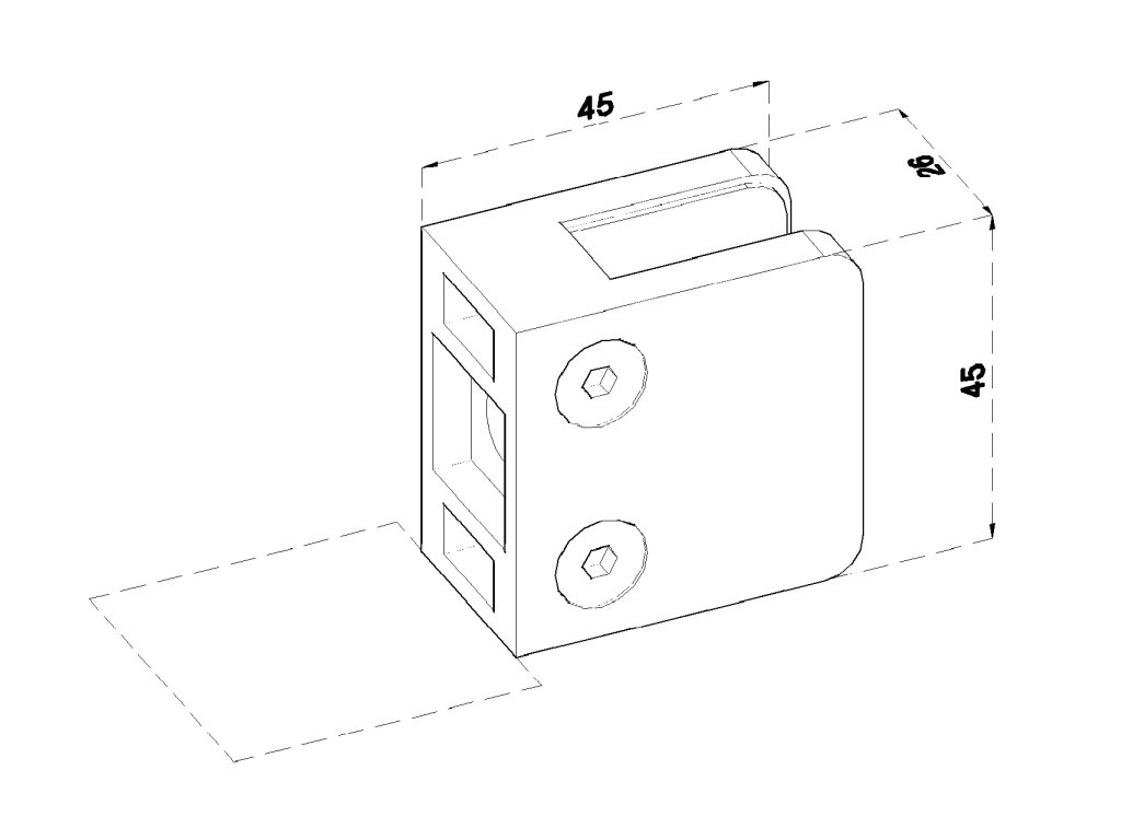 Svorka skla / plechu plochá (45x45x26 mm), bez úchytových šroubů a krytek na šrouby, leštěná nerez / AISI304, balení neobsahuje gumičky na skloDoplňkové parametry