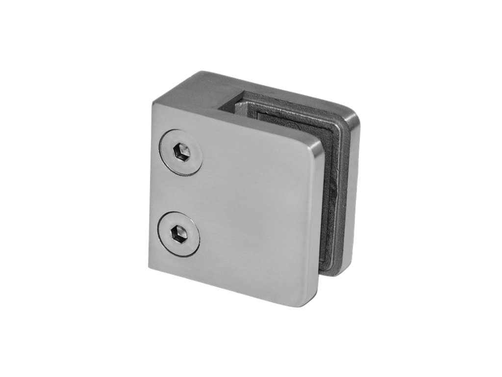 Svorka skla plochá (45x45x26 mm), broušená nerez K320 / AISI316, balení neobsahuje gumičky na sklo