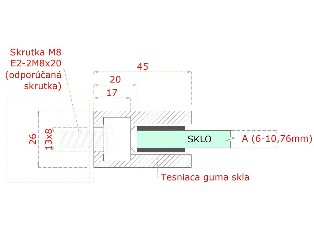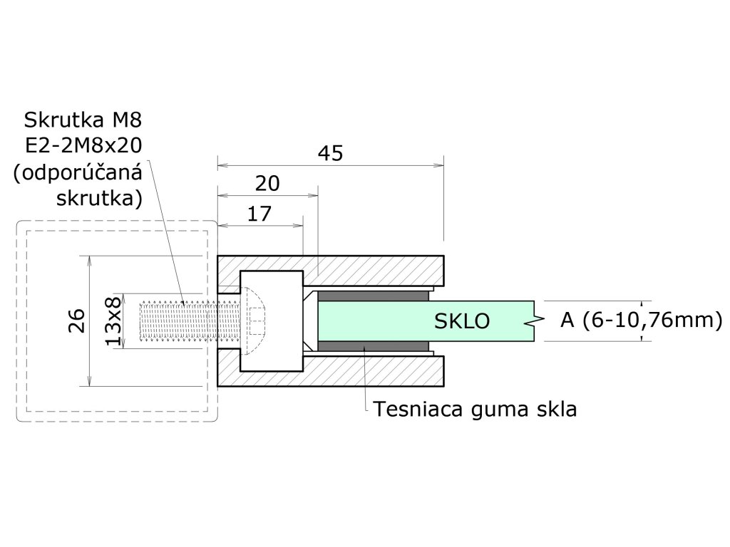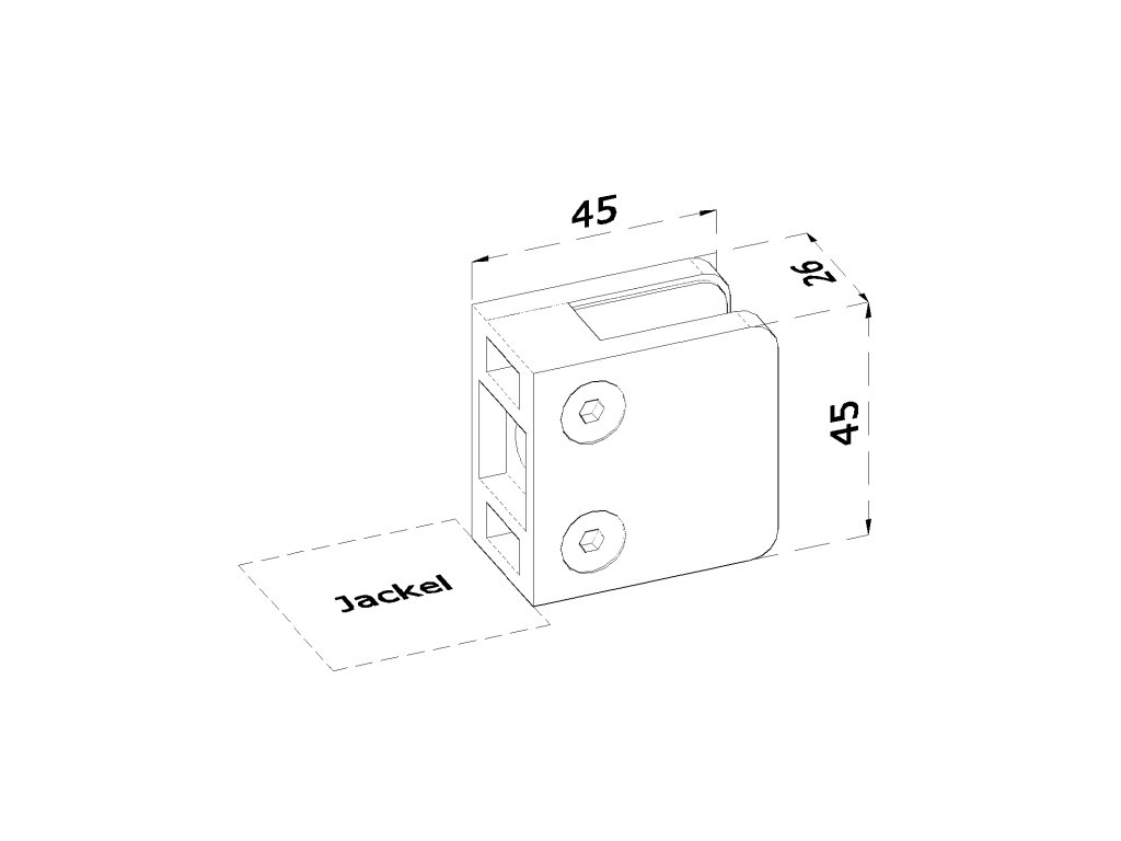 Svorka skla plochá (45x45x26 mm), broušená nerez K320 / AISI316, balení neobsahuje gumičky na skloDoplňkové parametry